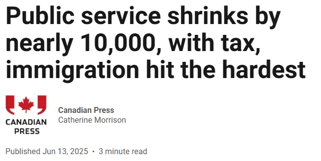 加拿大税务局在2024至2025年间裁减了6,656人,员工总数从59,155人减少至52,499人。移民、难民及公民部的员工人数从13,092人降至11,148人,裁员1,944人。