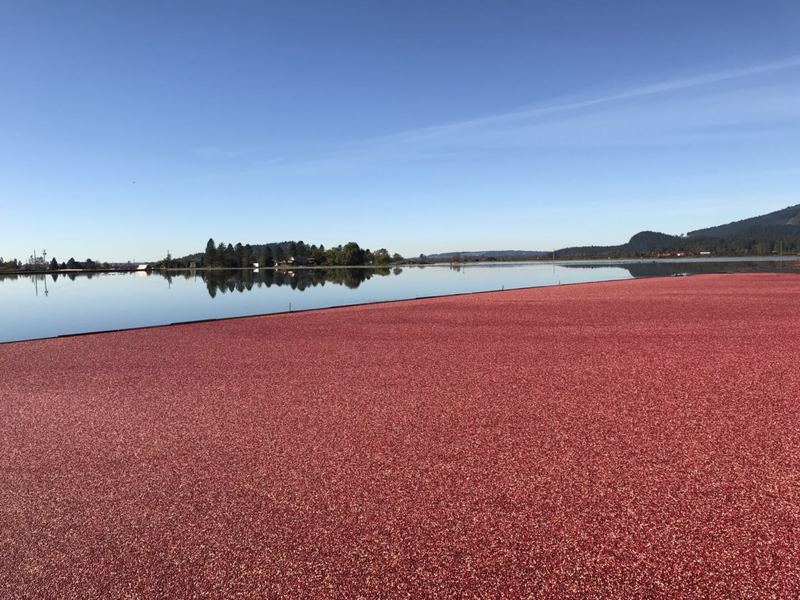 蔓越莓是一种多年生植物,属常绿灌木,在北美的一些地区大量种植,Pitt Meadows市即其中之一。蔓越莓的浆果用来做果汁、果酱等。蔓越莓酱(cranberry sauce)是加拿大和美国感恩节的主菜火鸡的传统配料。因为是灌木,蔓越莓低矮,匍匐在地面,绿绿的,不很显眼。蔓越莓在成长过程中,需要大量的水。冬季和春季,即12月和4月要用水淹,防止严寒和霜冻,因此蔓越莓的地通常都是湿湿的,类似沼泽。当蔓越莓的浆果触感坚实,呈红色或深红色时,就要收获了。这时要往地里灌水,水位可高达40厘米,然后用一种绰号为“打蛋器”的机械搅拌水使浆果脱离蔓藤。浆果因内部有少许空气,会漂浮在水面上。我们要看的是最后一步:将浮在水面的蔓越莓的浆果收集起来并送到货车上。这应该是在一天内做完的事情,因此要看到并不容易。