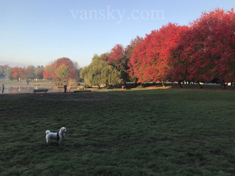 早晨8:30我们就赶到了在Trout湖旁边的农贸市场。此时三面绿树围绕的Trout湖的远方晨曦初现,若大的湖象沉睡未醒,水雾仍在,波澜不兴,静得不能再静。有数的几个行人、水禽也是悄悄的。只有草地中的枝繁叶茂的枫树群,在初阳下红红地绚丽着,明媚生动。