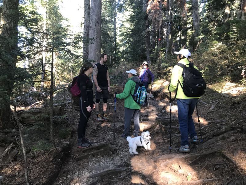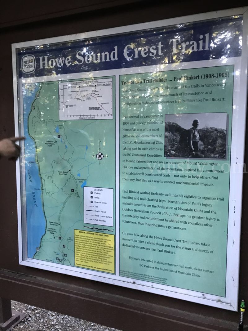 在上路后不久,在一告示牌处,有此次行走路线的指示,还专栏介绍了远足路线的建设者波尔.宾科特(1908 --- 1995)。波尔从50年代到温哥华后,就成为BC登山俱乐部的一位重要成员。他登了很多难于攀登的山。后来他将他的登山热情转为对远足路线建设的热忱,修建和清整路线,尽量减少人类对山脉的干扰和破坏。他作为志愿者孜孜于此直至80多岁。今天北温和西温的山脉中900多公里的远足路线,实有赖于波尔这样的人的不懈的努力。看后肃然起敬。我们还看到一对父子,在我们行走的路上,每隔数米挖一沟,防止山水对路面的冲刷。