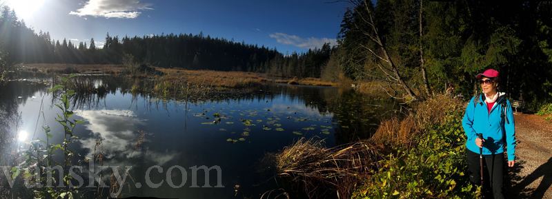 实际上那天我们兵分两路,在怀特湖边会合后,Bana见到木若石和Helen正在照相,就说我现在有个新方法,可以让两个你同时出现在照片中。她说,这是用苹果手机的全景功能,你先站在一棵大树下,相机照到你后,继续移动到树,此时你从树后,走到树的另一边,等相机再照到你并停止时,两个你就在相片上了。