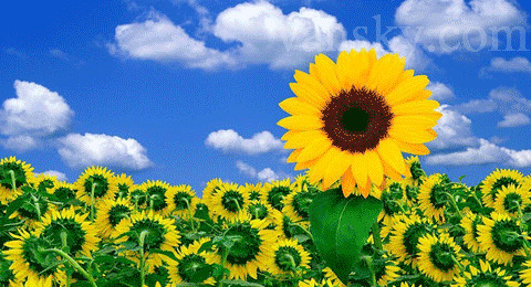蓝色的天空为背景,黄色的葵花,浅绿色的茎秆,深绿色的叶子,形成了干净通透的美丽画面,画家作画的激情是在这蓝天白云下产生的吗?一定是的!