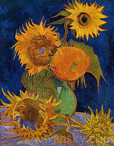 备注:《花瓶里的五朵向日葵》被认为是第二幅画作品,浓重的宝蓝色墙壁前,罐子里有三朵花,前景的桌上放着另外三朵。