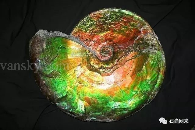 1908年,一名国家地理调查队的成员在阿尔伯塔圣玛丽河沿岸发现斑彩螺的矿化化石。可是直到1981年人们才开始将美丽的斑彩螺化石加工成宝石。藏在深闺无人见,华容一露天下知! 1981年加拿大的斑彩螺化石正式被承认为宝石,其他地区的鹦鹉螺可没有此待遇,没办法,其他地区的鹦鹉螺化石多为褐色,穿着土黄色的衣裙的村姑岂敢与身着七彩华服的仙女争锋!