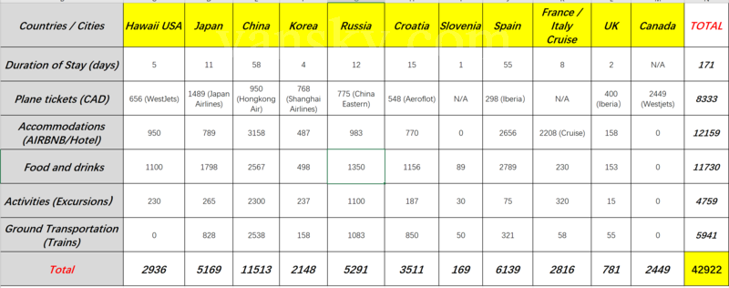 在这半年里,我们访问了12个国家的30多个城市。我将所有费用分为4类。