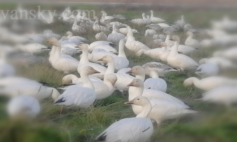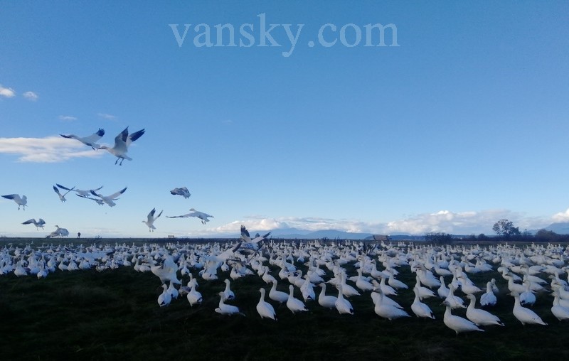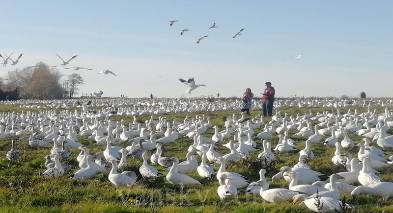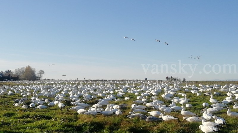 今年11月7日立冬那天,温哥华难得有了好天气,红日照碧水,天高白云淡,人人都愿意到野外享受温暖的阳光。我和胖胖爹登上了River Road的大堤,只见一片茫茫的白色覆盖了大堤旁绿色的草坪,定睛一看,几乎望不到边的雪雁群栖息在此地,天上还有排成人字形和一字形的雪雁群连绵飞来,铺天盖地,让大地像立刻铺上了一层洁白的雪花,覆盖了眼前的绿茵茵的草地,真真应了雪雁的名号!