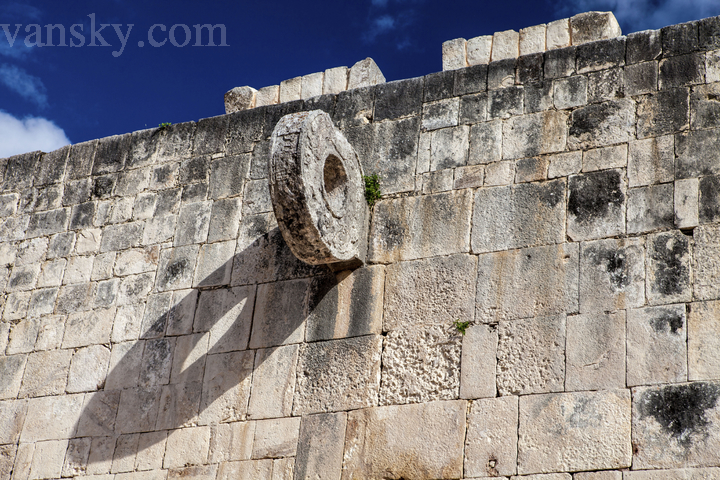 在奇琴伊察蛇羽神金字塔西北处的球场引人注目。这是古代中美洲最大的球场,166米长68米宽,石墙高度为8米,墙上是观球台,两面石墙东西相对,南北各有高台,供国王和大祭司就坐。据说球质为当地产的橡胶,球赛的规矩也很奇特,球员不能用手或足碰球,只能用肩膀,手肘,胯部运球和击球。更难为人的是球框为树立的石环,矗立在6-7米左右的高墙上。即使姚明穿越到当时的古玛雅,要进球绝对是个难度极高的技术活。我有些怀疑当年玛雅人的身高,导游很骄傲地告诉我,别看我们现在的玛雅人身材矮小,当年却有高大威武的队员,否则就不会建造这样宏大的球场啦。不过,奇琴伊察的球赛也是一种宗教仪式,祭司会先卜卦, 结果密不可宣,因为胜者不但不能衣锦还乡,封妻荫子,却要将大好的头颅奉献给神灵,说是最优秀的人方能与神灵沟通,给族群带来好运。