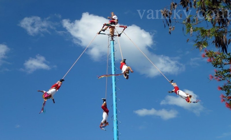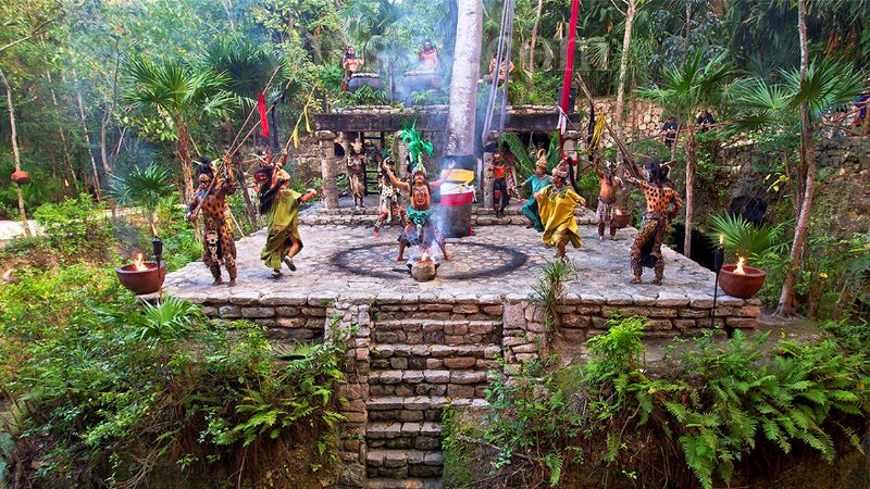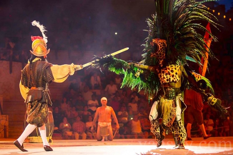 晚上七点,在可容纳六千观众的大剧场开始上演名为Xcrate 墨西哥华彩秀,上了彩妆,身着玛雅传统服饰的男女站在通往剧院的路边和拱门上笑迎八方来客,让人对表演多了许多期盼。