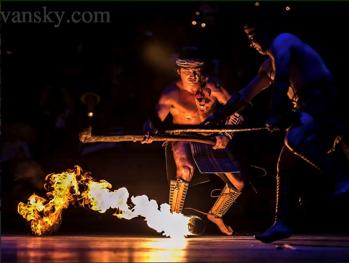 华彩秀分成两部分,上半部表现玛雅人原来的生活和欢乐。舞台上出现了古玛雅球场,队员们再现了当年球赛。最好看的是火球赛表演,舞台的两侧安置着半人高的火盆。在剧场灯火全无的情况下,只见黑暗中的两队球员你追我赶,用长度类似冰球杆,杆头却不是扁平状的球拍不断击打冒着烈焰的火球,直到将火球打入对方的大火盆内。 戴着长长羽翎头冠的大王,带着族人朝拜神灵,众人载歌载舞,场景热闹欢快。