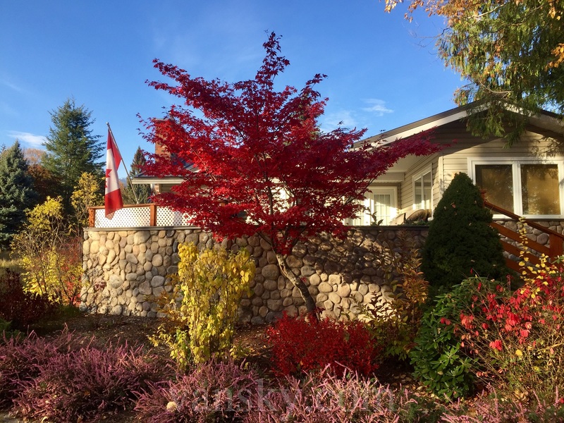 掩映在一片明艳动人秋景中的一户人家的房子映入眼帘,院子里斜插着一面加拿大国旗。是的,生活在风景如此优美的国度,自豪感是油然而生的呀!就连在桥上驶过的运货火车,车厢也是一节节色彩各异,配上远处的雪山,蓝天白云和清澈流动的河水,眼前一幅幅让人窒息的秋景图让我恍惚觉得和这小城的邂逅仿佛就是前世的一场约定!