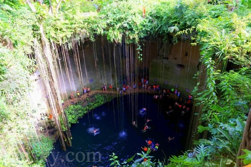 尤卡坦半岛有大小6000多个个天坑深井, 我们只去了两个。一在图伦古城附近,天坑口呈椭圆形,可以看见十几米深处的水源。沿着天坑的一侧建有进入坑底的阶梯 ,方便嬉水的游客。只见大姑娘,小伙子和一群只有半人高的小朋友们兴高采烈地下了坑,扑通扑通地往深蓝色的水里跳,在天气炎热的夏天,这里真是个消暑的好去处!