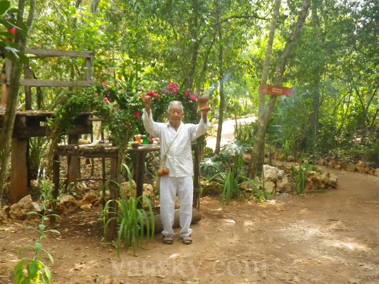 第二个大型天坑在尤卡坦半岛的西北部,天坑附近就是玛雅的小村寨。村里的老祭司身着白衣白裤,手持陶质香炉,当香炉飘起阵阵白烟后,他口中念念有词,为众人祈福,然后让大家进了村。导游让我们参观了玛雅人的住房展示间。房子由拳头粗的木棍围立而成,上方搭茅草屋顶。房子很小,一侧为火塘,存放食物和工具的地方,另一侧悬挂吊床并设有小祭台。村子里人很少,不知是特为旅游设的景点还是原来他们就是住在此地的原住民。