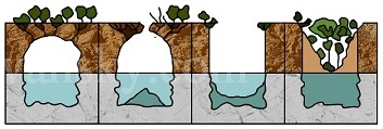 (此图简单明了地说明了天坑的形成和结束,我们去的第一天坑如图三,第二次去的天坑如图二,Xcrate 的河流与类似图一的暗河相连,黑豹王国的天坑如图四的话,大王就挂了)