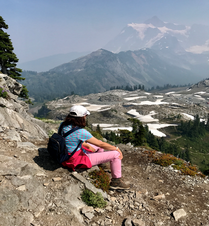 “天青色等烟雨,而我在等你”——贝克雪山啊,我们都在等着你,等你能穿透雾霾,露出壮观的真面目!贝克雪山属于火山喀斯喀特地貌,周围环绕着许多大小不一的山峰,青峰秀丽,山栾起伏。在缺雨的今天,群山没有等到烟雨,却等来了下午的山风。雾霾消散了许多,峰峰相连的贝克雪山群慢慢露出了倩影。我们的停车之处在群山中的山涧平台,南面的美术家之巅(Artist Point)可同时眺望到依然蒙着薄薄面纱的贝克雪山,萨克森山(Mt.Shuksan)和桌面山,与晴日相比,各山另有一番风情。