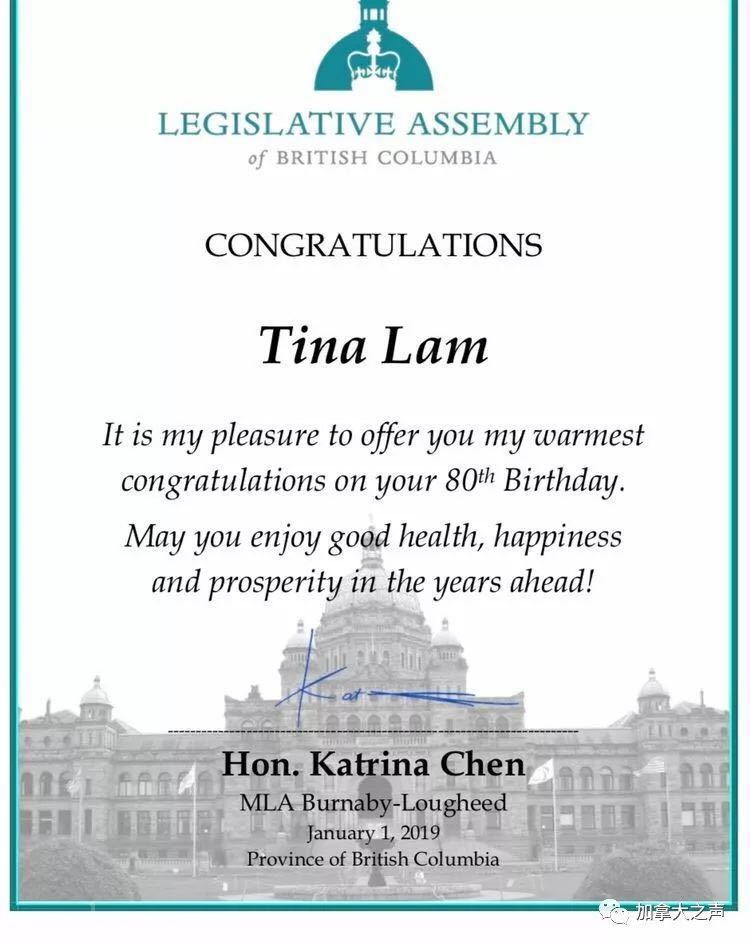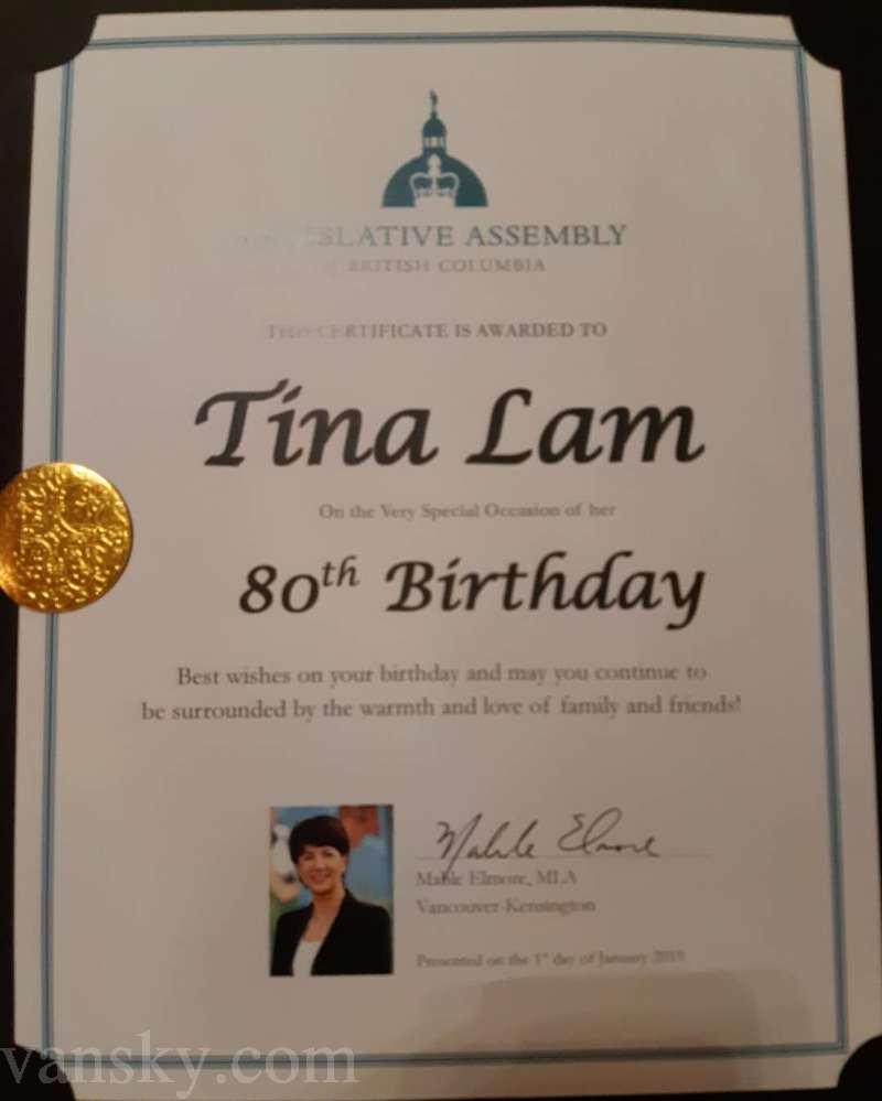 为林锦欢80岁生日,送来贺状或贺卡的政要有:中国驻温哥华领馆佟总领事 ;省家庭及儿童保育厅厅长 Katrina; 省议员MAble ;