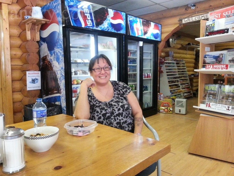 3)三位女当家 距离林娜温泉不远,有一处很漂亮的原木结构的小客栈,同样是兼有其他加油和用餐功能。与其他小店不同,我们一进门,女当家的就请我们脱了靴子摆放在门口,室内异常干净,小小的厅堂里还摆放着白色小熊的标本,墙上挂着大角鹿的装饰。女当家和其他两位女性掌管着小店,他们都是原住民。我们一边用餐,一边与女掌柜攀谈。她家在TUK城,来此地已久。我们原本就和北美的原住民长的相近,结果就和女当家攀了亲戚,五千年前是一家。BC 省的北部人烟稀少,到了育空地区和西北领土之后,沿途只有屈指可数的小镇和旅馆。旅馆夏季有游客帮衬,冬季里只有运货的大型卡车司机,与他们打交道,估计和以前的车老板,马帮头有得一拼。鹰原旅馆的女当家年约五十以上,说话干脆利落,指挥着两位男大厨,两位女员工(一名招待,一名清扫)和两位维修加油的男士,颇有孙二娘之风。