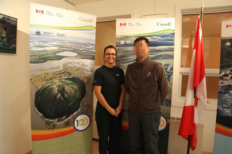 6)热心的女公仆 我们在Inuvik 小城里游览,邮局的胖女士热情地给我们的信封和明信片加盖了Inuvik 的特别印章,以留作纪念。在邮局的门口,我发现了加拿大公园管理字样的牌子,便和朋友们走了进去。一位年轻而干练的女“公仆”接待了我们。她叫Rachel Hansen (瑞秋 韩森)。父亲曾在加拿大最北部的军事基地服役,经常带幼小的瑞秋在野外游戏,所以从小瑞秋就对户外活动,野外生存十分熟悉。瑞秋长的很年轻,交谈之后,才知道她已是三个孩子的妈妈!当她得知我们因游客中心冬季关闭而无法获得更多的信息之后,便热情地为我们介绍当地的风景,地貌和国家公园。办公室里悬挂着非常独特的油画原作和装饰图案,我十分惊讶,因为加拿大政府节省开支,不可能花费巨资购买如此美丽的办公室装饰画。瑞秋告诉我,他们公园管理处每年夏天都会邀请一些艺术家到公园小住,写生。艺术家们离开时会将各自的一幅作品捐赠给公园管理处,双方皆大欢喜。瑞秋还将我们带进他们的会议室,因为里面有一我们极为想看到的北极熊皮。办公室的其它同僚对我们也非常友善,根本没有政府机构官员们常见的冷漠。瑞秋还赠送给我们加拿大北部省份的地图,上面标注着各个国家公园,希望我们将来有机会去观光。我们没有想到,在寒冷的北部,我们贸然闯进了政府的公园管理处,却受到了热情的接待。谢谢你,瑞秋!