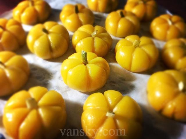 我先请Teresa教我做南瓜小饼,只见心灵手巧的她,用蒸熟的红色的地瓜打碎,和上糯米粉,包上红豆沙,用小勺子在外部浅浅地刻上瓜纹,上面插上一小小的绿芹菜杆,一个个金黄色美丽的小南瓜饼就成了!往桌子上一摆,谁见了能不伸手啊?