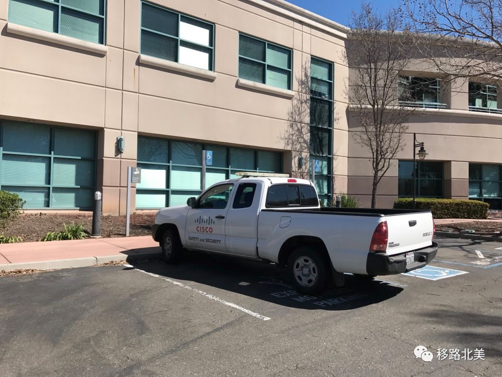 忽然看见一辆工程车停在门前,思科的logo赫然印入眼帘,走下车想和车子拍照,可是想不应该是到此一游的感觉,应该是回家的亲切,于是围着建筑慢慢的走了一圈。我尝试着寻找传说中的一个故事,说一个卖中式煎饼的斯坦福大学生,就是在思科和园区的几个大公司门口卖早点,居然月入十万美金?也许就是这些励志的故事激励着无数梦想创业的年轻人来到硅谷,从事着各种尝试,更多的是失败,但是也就是几个凤毛麟角的成功故事,为那些期望通过自己的努力去改变自己和家人的命运的年轻人,点燃了奋斗的航标灯。