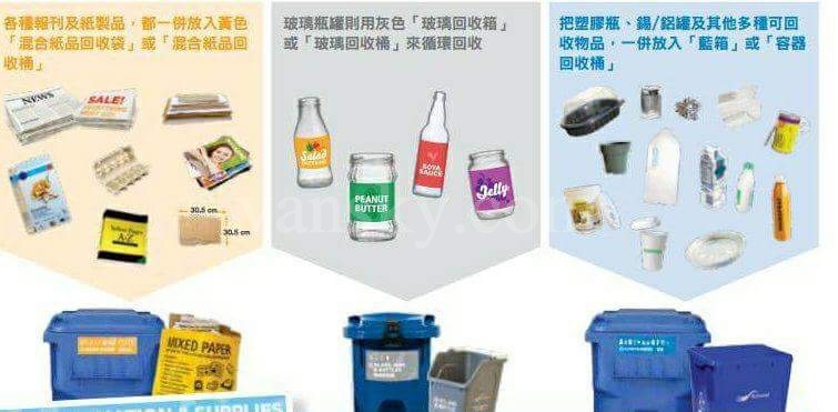 2、蓝色垃圾桶(Recycling Cart),主要放置喷雾罐,玻璃瓶,金属罐,牛奶罐盒,鸡蛋盒,信封报纸,纸箱等可回收垃圾的。不同城市还稍有区别,有些城市分类更加具体,用蓝色垃圾箱(放置饮料瓶罐盒等),灰色垃圾箱(玻璃瓶罐等)及黄色塑料袋(报纸及干净的包装盒箱等,纸箱必须压扁,有塑料部分需要分离出来),将可回收垃圾再次进行分类,替代蓝色垃圾桶(Recycling Cart)。