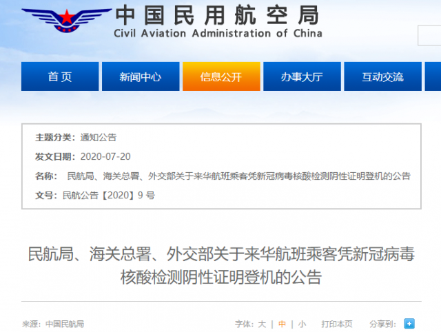 国内时间7月20日,中国民航局、海关总署、外交部联合发布了关于来华航班乘客,需要凭新冠病毒核酸检测阴性证明,才可登机的公告。