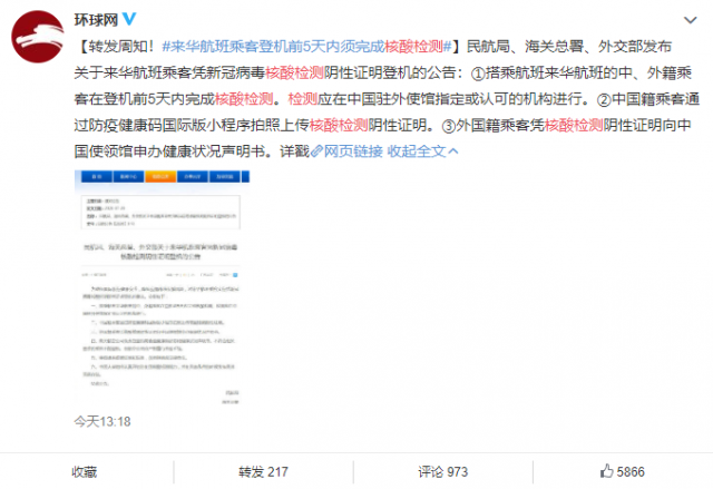 新规要求,不管是中国籍,还是外国籍,都需要在登机前5天内,进行新冠病毒核酸检测,并且拿到阴性证明,才可以登机回国!在这条新规之下,海外华人、留学生回国更难了!
