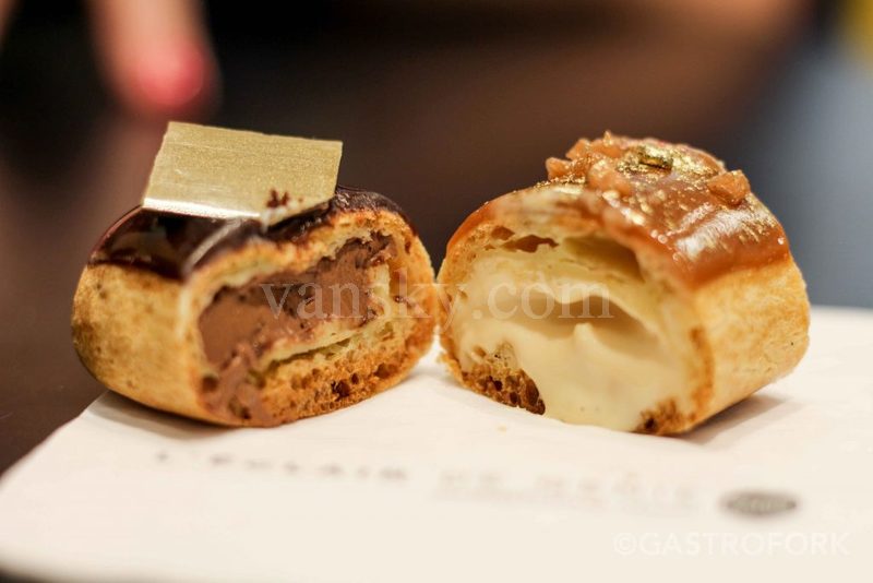 Caramel Beurre Sale金箔咸焦糖马斯卡彭奶油口味适合本身对甜食不太感冒的人。因为有着带有咸味的焦糖在其中,这款éclair赋予了甜食新的含义。咸有时也是另一种甜。金箔更是吸引很多人的目光,时尚与美食的结合,在L'Eclair de Genie展现的淋漓极致。