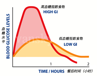 加拿大内科医生詹金斯(Jenkins)于1981年提出的食物血糖指数被医学与营养学广为接受,是饮食健康的一个重要概念。血糖指数其实就是测量食物在体内变成血糖所需的时间。对含有相同糖量的不同淀粉质来说,我们吃了血糖指数高的食物后血糖会快速增高,之后又快速降低。血糖指数低的食物让血糖缓慢增加,缓慢下降,对胰岛素分泌系统的刺激较小,有助于避免糖尿病。各种食物的血糖指数不同,例如豆类和玉米颗粒比米饭和面食低很多;苹果和梨子比西瓜和葡萄低很多;各种青菜比南瓜,胡萝卜和甜菜低很多。从以上的几个例子我们可以看到一个趋势,就是需要多咀嚼的食物因为含有更多的纤维素,血糖指数一般比较低。经过细磨或提炼的食品口感较好,大家也觉得较易消化,因而比较欢迎,但一般没有粗粮健康。例如精面面包不如粗面面包健康,玉米粉不如玉米颗粒健康,煮得透的面条比稍煮的面条血糖指数高。