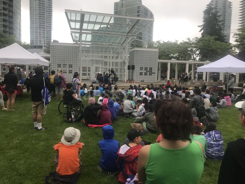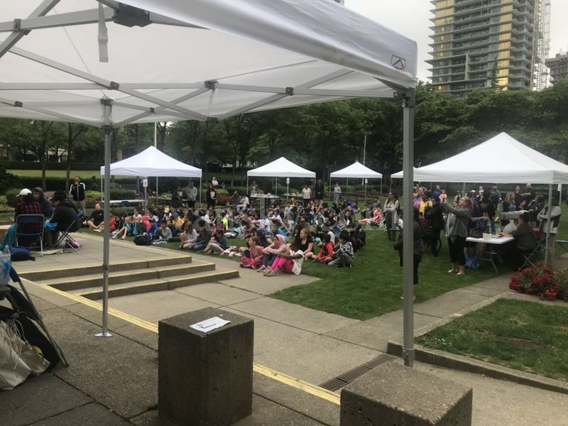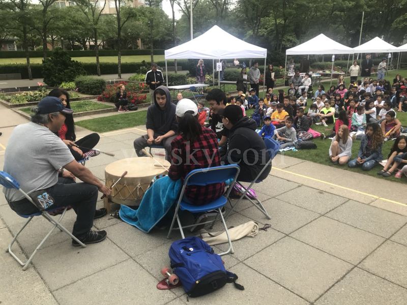 今早我经过中央图书馆,那里正举行庆祝活动。现场鼓声咚咚,紧密而有节奏,草坪上坐了不少各族裔小学生,舞台上有两个原住民的鼓手领着四个少年在击鼓。两边有临时支起的白色的凉棚。仪式结束后,学生们可以简单地吃点有原住民风味的食品,看与原住民有关的书籍,甚至可以作画,描摹原住民的生活和生存环境。