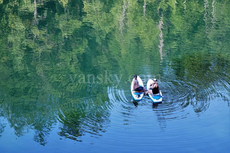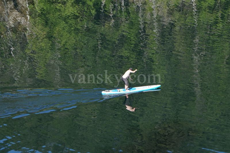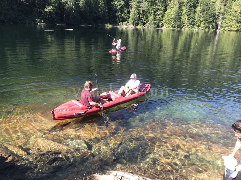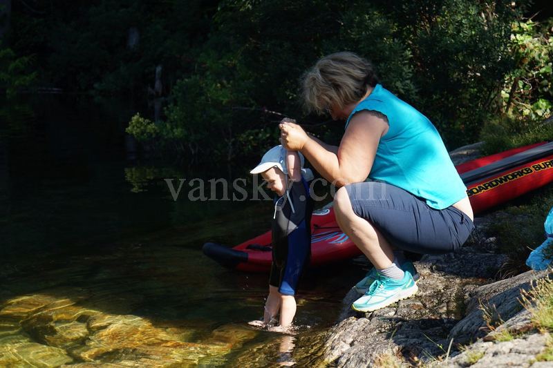 我们去的离停车场最近的一块大石块上已经有两只小船,还有一个女士带着一个一岁多一点的小男孩在玩耍。小男孩穿着一身防水服,女士是小孩的姑姑,不一会她拎着小男孩的胳膊试探式地、轻轻地将他放入水中。小男孩并不惧怕,嘻笑着、一脸顽皮,当时的水温为16、17度,多亏阳光照热了身体。