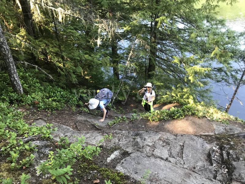 我们照了一会相,就开始了我们的环湖之旅。由于环湖的山十分陡峭,我们在羊肠小道上行走,比原来想象的要艰苦。有时一块巨大的石头挡住了路,这时就要把树干当梯,有时要将树根当绳,向上攀行或向下行走。有时坡度为60至70度,要走5、6米。我们是上上下下,曲曲折折,前后呼应,相互关照走完这程路的。