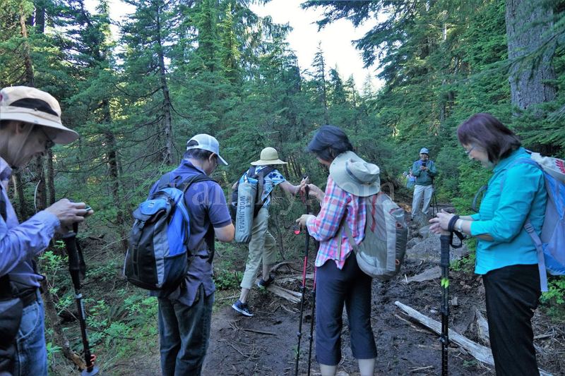 这里蚊虫小咬特别多、向等候中的我们不断袭来,就是怕晒的女士,也只好走到从树间射来的正午的阳光下,以避其锋。我们在这泥足深陷,少说也有50分钟,一时甚至产生了按原路撤回的想法。最后是大雄在巨木的右边发现了路。原来木就是一段路。他和老徐又往前走了一段,确认了这确实是我们要走的通向神秘湖的路,我们才又上路。后来从大雄的Alltrails看,他自己在那急急的找路时所走的路,密如蛛网。