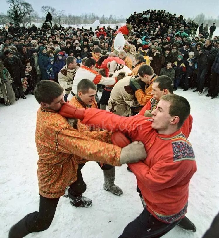 对,打架。俄罗斯人在过节的时候需要集体打架才过瘾。在节日的这一天大吃大喝一顿,吃饱了撑的就开始找刺激,精力充沛的年轻小伙子们就开始玩拳斗比赛,同时也可以发泄自己的苦闷。