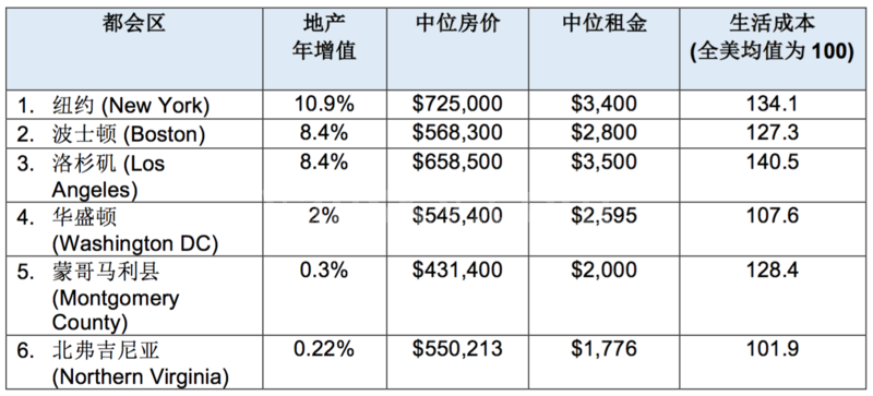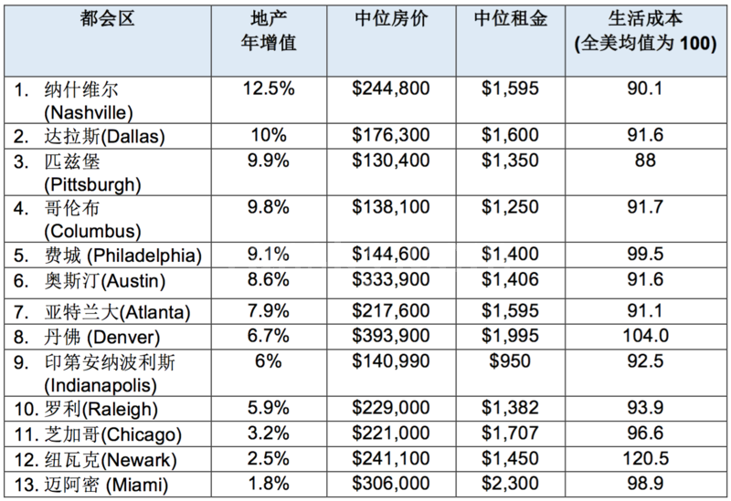 入围的共有19个美国都会。其中洛杉矶(公寓)(置业)为西海岸唯一的“幸存者”;丹佛(Denver)、达拉斯(Dallas)、奥斯汀(Austin)均地处密西西比河以西;华盛顿、蒙哥马利县(Montogmery County) 和北弗吉尼亚(Northern Virginia) 位于 “大华府地区(the Greater Washington DC Area)”;大多数城市聚集在大西洋海岸。