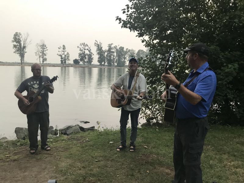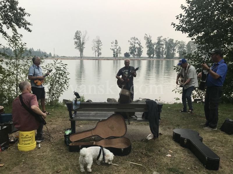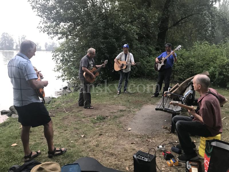 我又到河边散步,又看见了河边的乐队。老哥五个,都50岁上下,高高兴兴,在这演奏。一问,只要天好,人能凑齐,他们就来。他们停下来时,谈笑风声,还喝几口啤酒。演唱起来时,虽然从容,但不管有人看没人看,都十分认真。我很欣赏他们意气相投的劲头和共娱共乐的心态。我录了相。回来一放,还真好听好看,特别亲切。